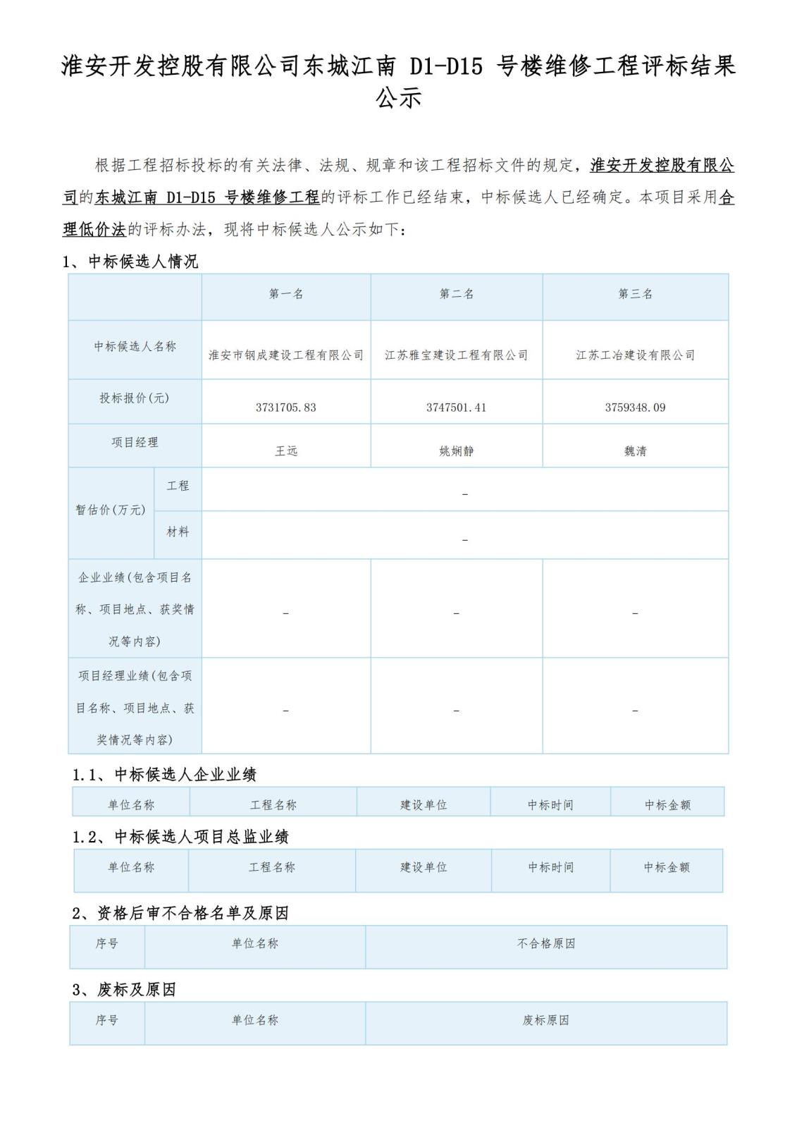 淮安開發(fā)控股有限公司東城江南 D1-D15 號樓維修工程評標結(jié)果公示