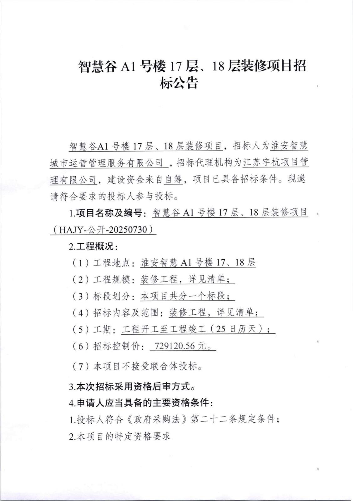 智慧谷A1號樓17層、18層樓裝修項目招標(biāo)公告